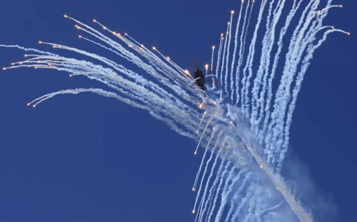 這是由4架直10組成的菱形隊(duì)伍,到達(dá)觀眾區(qū)后4架直10突然同時(shí)拉起、飛到頂點(diǎn)后打出漂亮的干擾彈,之后四架飛機(jī)朝四個(gè)不同的方向倒轉(zhuǎn)飛行,數(shù)秒內(nèi)在天空中形成一個(gè)絢麗的“花朵”,完美地展現(xiàn)了四機(jī)開(kāi)花的驚艷。